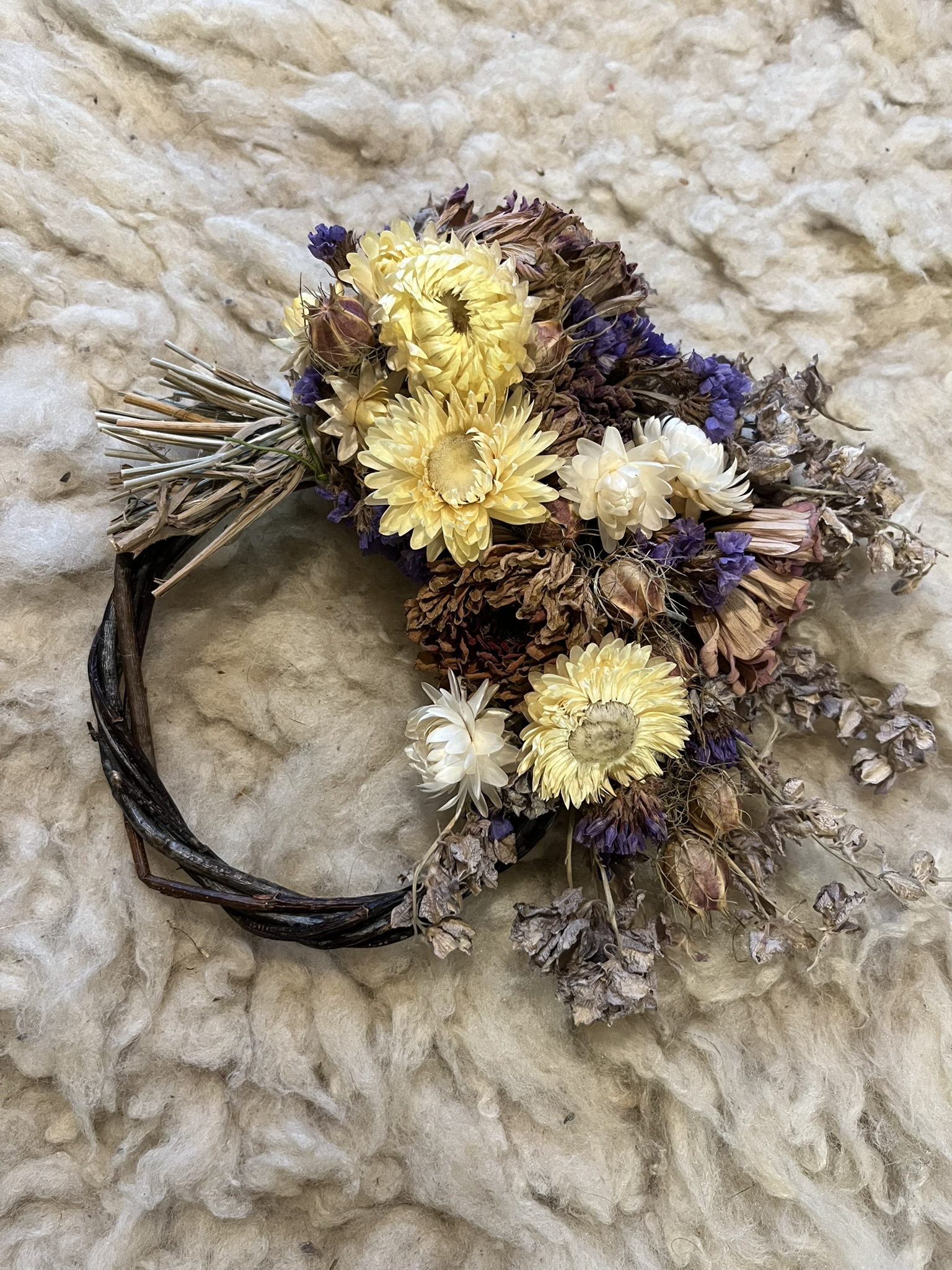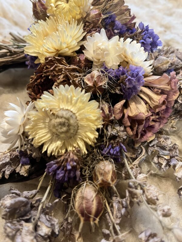 Our dried flower wreaths are made entirely of natural materials: willow or grapevine bases, cotton thread, jute twine, and organically grown and naturally dried flowers. That means they are completely biodegradable. Although they can last for many years, when the time comes for it to return to the earth from which it came, you can compost it, burn it in a backyard fire, leave it to decompose in your yard somewhere, or return it to us at the farm and we can compost it for you.